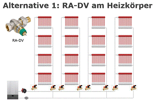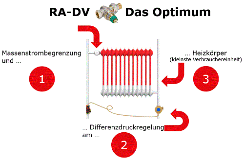 Dadurch wird (dynamisch) für jeden Lastfall der Massenstrom an der kleinsten "Verbrauchereinheit", nämlich dem Heizkörper, konstant gehalten