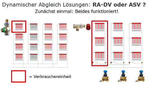 Die Alternative zu Schritt 1 und 2 ist das dynamische oder druckunabhängige Thermostatventil. Im Prinzip werden die Funktionen Differenzdruckregelung und Massenstrombegrenzung von einem Ventil "erledigt" (siehe Grafik). Pro Strang sind dann nur noch Absperrventile einzubauen (bitte den max. Differenzdruck über dem dyn. Ventil = 0,6 bar / 60 KPa beachten)