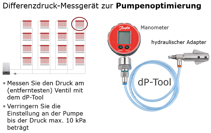 Das Ziel: Die Förderhöhe soweit absenken, dass am entferntesten Heizkörper der minimal notwendige Differenzdruck anliegt - mehr ist es nicht Diese Grafik zeigt noch einmal die "Idee" der Optimierung mit einem Messgerät (dp-Tool)