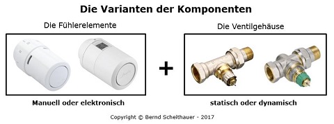 Die Funktion der Komponenten ist einfach zu beschreiben. Das Fühlerelement erfasst die Raumtemperatur über ein im Inneren vorhandenes Bauteil (Wellrohrelement), das mit einem Gas oder einer Flüssigkeit gefüllt ist. Bei steigender Temperatur dehnt sich das Gas/die Flüssigkeit aus, bei fallender Temperatur zieht es/sie sich zusammen. Durch die Volumenänderung wird eine mehr oder weniger große Kraft auf die Ventilspindel des Gehäuses ausgeübt, die das Ventil öffnet oder schließt.