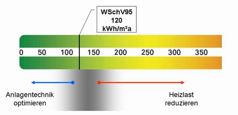 Ich stelle einmal den Grenzwert von 120 kWh/m²a + X der Wärmeschutzverordnung von 1995 zur Diskussion. Diese Tendenz belegen auch die Untersuchungen der Optimusstudie von Prof. Dr. Wolff und seinen Mitarbeitern. Daraus geht hervor, dass die Energieeinsparpotentiale durch die Anlagenoptimierung bei neueren Gebäuden mit einem guten Wärmeschutz wesentlich besser sind als bei älteren Häusern.
