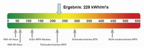 Das Ergebnis (= Energieverbrauchskennwert) von 229 kWh/m²a wird beispielhaft auf dem "Bandtacho" als Vergleichswert eingetragen.