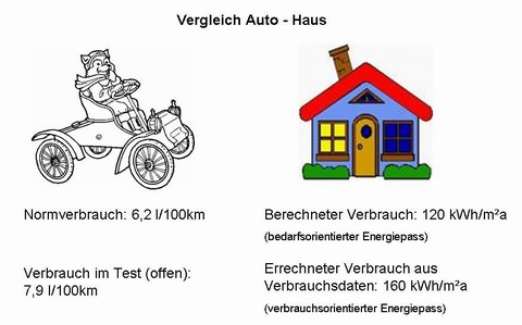 Deshalb an dieser Stelle gleich ein Wort zum Energiepass: Viel mehr sagt der verbrauchsorientierte Energiepass (inkl. realer Werte für den Warmwasserbedarf und Klimafaktor) für Wohngebäude auch nicht aus. Den bekommen Sie zwar schon für kleines Geld, aber für den Fall einer Anlagenoptimierung ist dieser vollkommen nutzlos. Welcher Unsinn daraus folgt, lesen Sie hier in einem Bericht des Focus. Sie benötigen einen bedarfsorientierten Energiepass, der vom Fachmann, dem Energieberater, zu erstellen ist! Nur auf dieser Basis sind konkrete Maßnahmen zur Anlagenoptimierung möglich. Weitere Infos zum Energiepass finden Sie hier. Der Unterschied zwischen verbrauchs- und bedarfsorientiertem Energiepass lässt sich am besten am Beispiel Auto verdeutlichen. Wenn Sie heute einen PKW kaufen, dann spielt für Sie doch sicherlich der Verbrauch eine entscheidende Rolle. Das geht am besten mit wenig Gewicht (kleineres Modell), hocheffizienten Motoren und ohne Allradantrieb Dazu gibt es den Normverbrauch (Liter/100 km) als Vergleichswert zu anderen Modellen. Dieser Normverbrauch des Autos ist vergleichbar mit dem berechneten Energiebedarf Ihres Hauses und ist im bedarfsorientierten Energiepass, der vom Fachmann / Energieberater erstellt wird, dokumentiert. Wie hoch der tatsächliche Verbrauch Ihres neuen Sparmobils ist, hängt natürlich auch von Ihrem "Fahrstil", dem Nutzerverhalten ab, genauso wie der tatsächliche Verbrauch Ihres Hauses auch vom "Heizstil" abhängt.