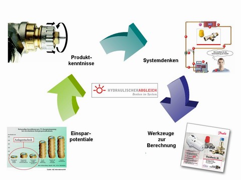 Einsparpotentiale erkennen, Produktkenntnisse erwerben, Abhängigkeiten verstehen und die Werkzeuge zur Berechnung beherrschen. Das sind die 4 Schritte, ohne die in der Praxis nichts geht - der Kreis muss sich schließen. Einsparpotentiale und Produktkenntnisse sind relativ leicht vermittelbar, das Systemdenken schon schwieriger. Oft scheitert der hydraulische Abgleich jedoch auch an nicht geeigneter, schwierig und umständlich zu bedienender Software.