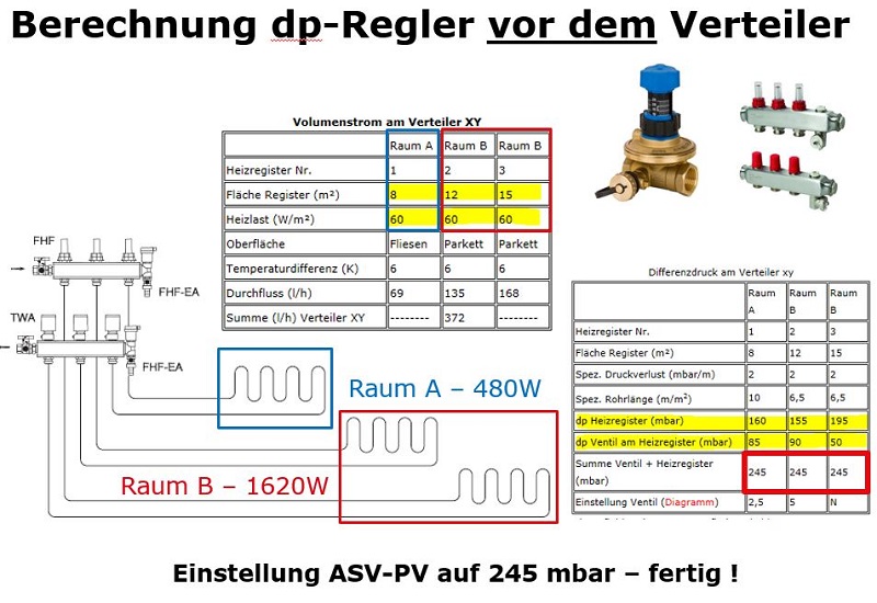 Die Lösung ist recht einfach. In einer Kombination Fußbodenheizung / Heizkörper muss immer vor dem Heizkörperkreis (oder dem Heizkörper) der Differenzdruck auf eine technisch sinnvolle Größe reduziert werden.