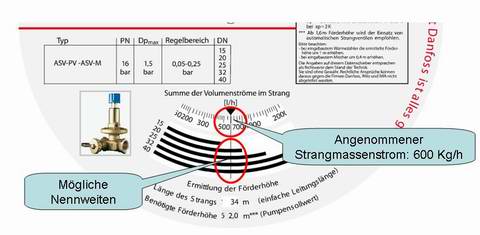 Zur Kontrolle der erforderlichen Nennweite der Strangarmatur werden die einzelnen Volumenströme der Heizkörper addiert.