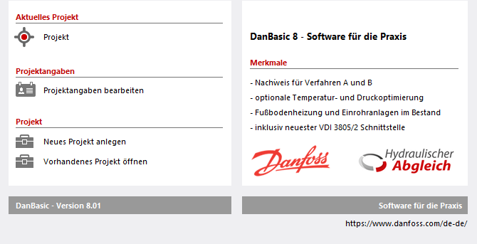 Hinweis: Falls Sie schon die DanBasic 7 nutzen bitte die Version 8 parallel zur Version 7 installieren. Es kommt automatisch der Vorschlag des Installationsverzeichnisses C:\danfoss\DanBasic8. Grund: Mit der neuen Version 8 wurden auch die neuen VDI 3805 Schnittstellen für Heizkörper und Armaturen integriert. Dadurch musste auch die interne Datenverwaltung angepasst werden. Projekte aus DanBasic 7 können somit (leider) nicht übernommen werden.