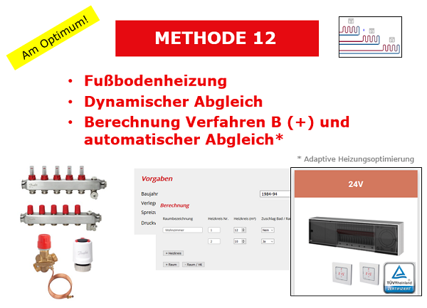 Methode 12: In größeren Anlagen mit mehreren Verteilern ist an jedem Verteiler (je Heizregister) ein Vorabgleich durchzuführen und vor jedem Verteiler ein Differenzdruckregler bzw. Durchflussregler einzusetzen. Dadurch wird je Zone (Verteiler) in jedem Lastfall der Differenzdruck konstant gehalten. Dies ist erforderlich, damit während des Optimierungsprozesses die Rahmenbedingungen (Differenzdruck vor dem Verteiler, max. Volumenstrom) weitgehend gleichbleiben.