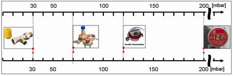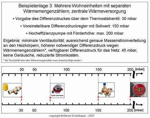 Alle Thermostatventile werden mit einem Differenzdruck von 30 mbar beaufschlagt, der Differenzdruckreglers wird auf 150 mbar eingestellt. Für das Rohrnetz und den Wärmemengenzähler stehen demnach max. 120 mbar zur Verfügung. Der Druckverlust des Wärmemengenzählers ist in jedem Fall zu ermitteln!