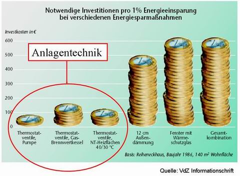 Diese Grafik zeigt, dass man mit relativ wenig (finanziellem) Aufwand viel Primärenergie und Geld sparen kann - jetzt! Denn die Investition in die Anlagentechnik ist im wahrsten Sinn des Wortes ihr Geld wert. Die notwendige Investition pro 1% Energieeinsparung ist in der Anlagentechnik außerordentlich niedrig.