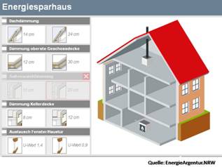 Mit diesem Sanierungstool der EnergieAgentur NRW können Sie am Beispiel eines zweigeschossigen Einfamilienhauses mit nicht ausgebautem Dach und einer Wohnfläche von 140 qm (Gebäudenutzfläche nach EnEV 189 qm) aus dem Jahr 1964 (Heizkessel aus dem Jahr 1975) sehen, wie Sie Ihr Gebäude energetisch in Stand setzen können