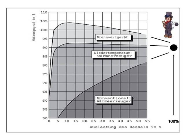 Diese Einsparung werden Sie jedoch nur erreichen, wenn Ihr jetziger Wärmeerzeuger ein "Uraltgerät" ist: Betrieben mit Konstanttemperatur ( > 70*C), mit hohen Bereitschaftsverlusten und überdimensioniert. Dies führt zu einem extrem schlechten Anlagenwirkungsgrad, was Sie in dieser Grafik schnell sehen können.