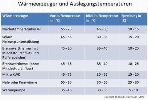Von großer Bedeutung für die Berechnung bzw. die Auslegung der geplanten Armaturen ist die Wahl des Wärmeerzeugers. Denn mit der Wahl des Wärmerzeugers werden gleichzeitig die Systemtemperaturen festgelegt. In der folgenden Tabelle finden Sie meine Empfehlungen, die generell auf der Basis folgender Rahmenbedingungen basieren.