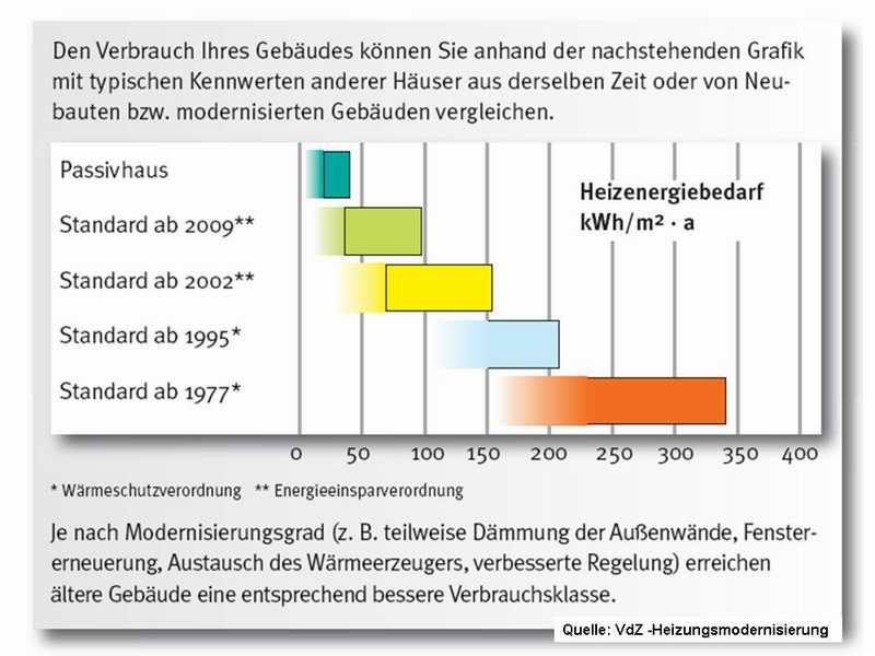 Typischer Werte von Gebäuden unterschiedlicher Baujahre liegen zwischen 40 und 300 kWh/m²a