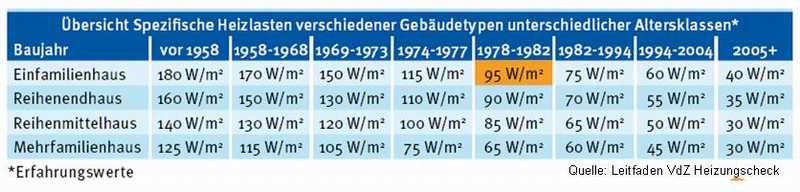 Typische Werte von Gebäuden unterschiedlicher Baujahre liegen zwischen 40 und 150 W/m². Eine Übersicht spezischer Heizlasten finden Sie hier