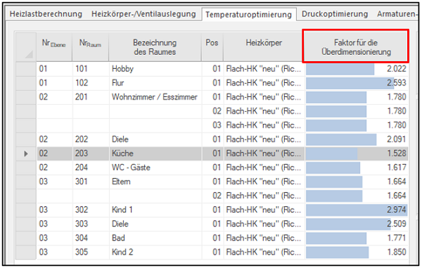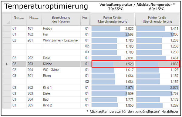 In der Spalte "Faktor für die Überdimensionierung" sehen Sie das Ergebnis der Überdimensionierung bei einer geplanten Vorlauf-/Rücklauftemperatur von 70/55°C für jeden Heizkörper. Erst mit dieser Tabelle haben Sie einen Überblick welcher Heizkörper der "Kritische" ist (kleinster Faktor, Raum 203 - Küche).