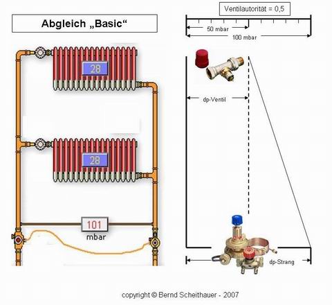 Bei einem Druckverlust am Ventilgehäuse im Auslegungsfall (Nenndurchfluss) von 50 mbar und einem Sollwert im Strang von 100 mbar beträgt die Ventilautortität = 0,5