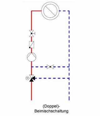 Eine andere Form der Beimischschaltung ist die Beimischschaltung mit Fixbypass, die bei Anwendungen, bei denen große Unterschiede der Temperaturniveaus im Primär- (Erzeugerkreis) und Sekundärkreis (Verbraucherkreis) auftreten, eingesetzt wird. Neben dem 3-Wegmischer wird zusätzlich ein Bypass zwischen dem Regelventil bzw. Mischer und der Heizkreispumpe montiert. Durch die feste Vormischung (Fixbypass) wird immer ein bestimmter Anteil abgekühltes Rücklaufwasser dem Vorlauf beigemischt. So wird erreicht, dass das Dreiweg-Stellglied über den gesamten Stellbereich arbeitet. Der Fixbypass ist manuell an der Einstelldrossel so einzustellen, dass bei voll geöffnetem Ventil bzw. Mischer und maximaler Kesseltemperatur die berechnete (maximale) Auslegungsvorlauftemperatur gerade erreicht wird. Zwischenstellungen der Dreiwegearmatur führen dann ausschließlich zu niedrigeren Vorlauftemperaturen. Die Leistungsregelung erfolgt auch bei dieser Beimischschaltung ausschließlich über das Dreiwegeventil.