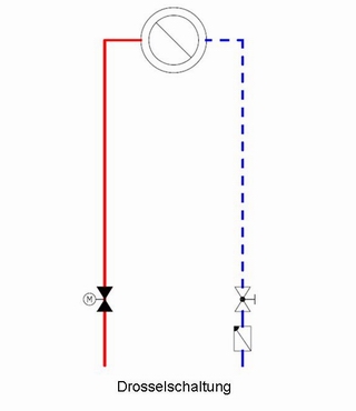 Bei dieser Form der hydraulischen Schaltung erfolgt die Leistungsanpassung über die Drosselung (über ein Durchgangsventil) des Volumenstromes. Daraus resultiert eine Beeinflussung des Volumenstroms im gesamten Kreis. Die auftretende Differenzdruckänderung führt zu einer Beeinflussung der einzelnen Verbraucher. Der (die) Betriebspunkt(e) der Pumpe(n) wird (werden) verschoben.