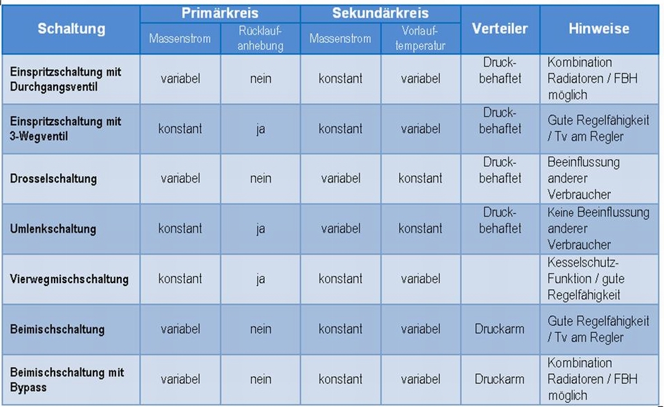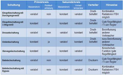 Bevor eine Anlage erstellt wird, müssen für die jeweilige Anwendung aus mehreren Möglichkeiten die passenden Schaltungen gewählt werden. Das kann ist nur dann gewährleistet, wenn der Planer die Einsatzmöglichkeiten der Schaltungen kennt. In der folgenden Tabelle wurden die häufigsten hydraulischen Grundschaltungen mit deren Eigenschaften dargestellt.