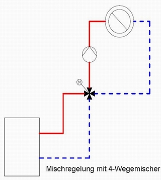 Vierwegeventile arbeiten grundsätzlich als Mischventile und dienen gleichzeitig zur Regelung der Vorlauftemperatur (mit stetiger Regelung) und zur Beimischung von heißem Vorlaufwasser zum Kesselrücklauf. Da der Umlauf nur durch Schwerkraftwirkung erfolgt, muss eine Schwerkraft-Auftriebsstrecke von 0,8 bis 1 m vorhanden sein (Montage über Oberkante Kessel). Vierwegemischer vermeidet Fehlzirkulation über offene Kurzschlußleitung und leistet definierte Rücklaufbeimischung im Vor- und Rücklauf sowie verhindert das Absinken der Kesselrücklauf-temperatur unter den eingestellten Wert (Sockeltemperatur). Kessel- und Netzwassermenge bleiben dabei fast konstant.